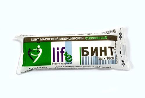 Бинт марлевый медицинский стерильный 5 м х 10 см - предназначен для фиксации, наложения, изготовления операционно-перевязочных средств. Материал - медицинская отбеленная марля, соответствующая техническим требованиям «ГОСТ 9412-93. Марля медицинская. Общие технические условия».