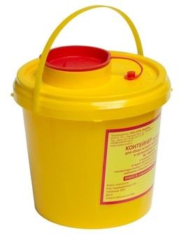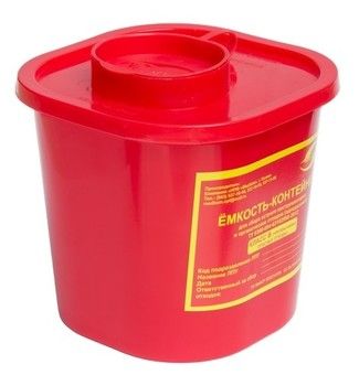 Контейнер для сбора острого инструментария - применяется для сбора колюще-режущих отходов (иглы, наконечники от скальпеля, скарификаторы, вскрытые ампулы и т. д.)