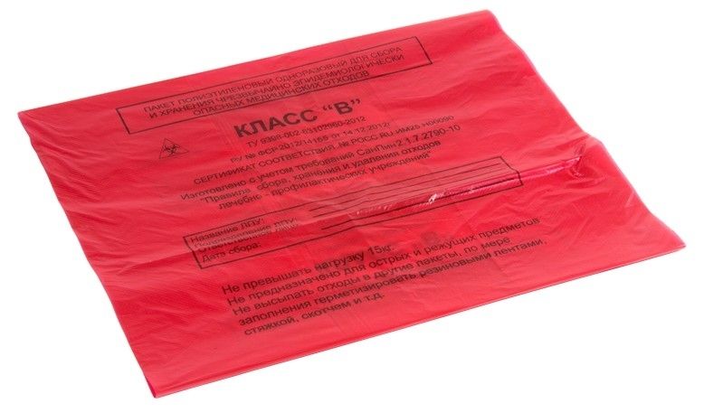Пакеты для утилизации медицинских отходов 500х600мм класса В (красные). Область применения: Потенциально инфицированные отходы. Материалы и инструменты, загрязненные выделениями, в т.ч. кровью. Выделения пациентов. Патолого-анатомические отходы. Органические операционные отходы (органы, ткани и т.п.). Все отходы из инфекционных отделений (в т.ч. пищевые). Отходы из микробиологических лабораторий, работающих с микроорганизмами 3-4 групп патогенности.