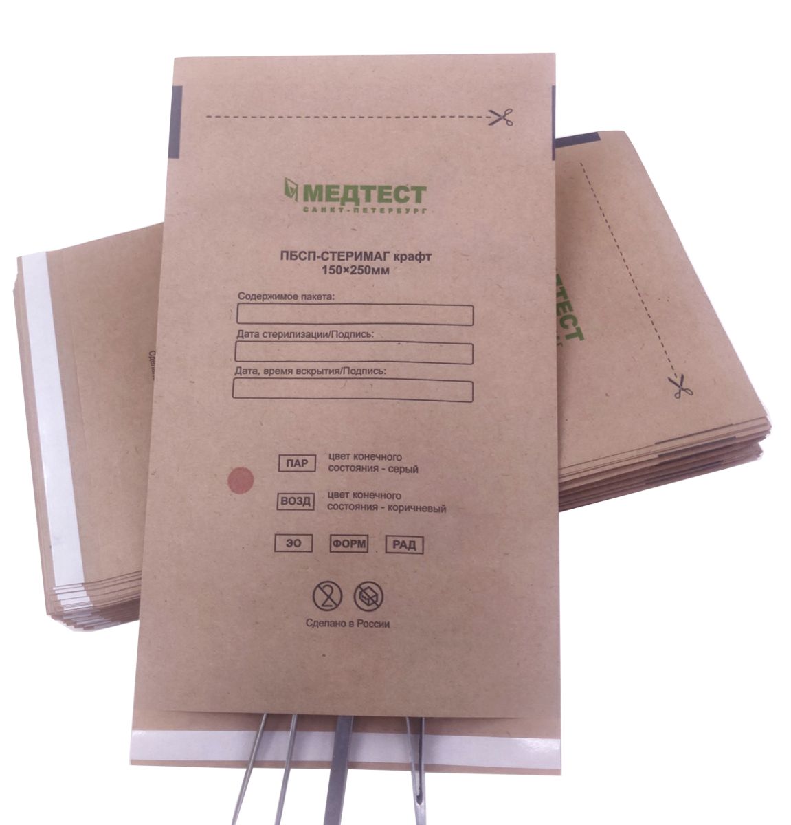 Пакеты изготовлены из специальной медицинской бумаги и отвечают требованиям, предъявляемым к медицинским упаковочным материалам по ГОСТ Р ИСО 11607 – 2003 "Упаковка для финишной стерилизации медицинских изделий" и Европейскому стандарту CEN EN 868.