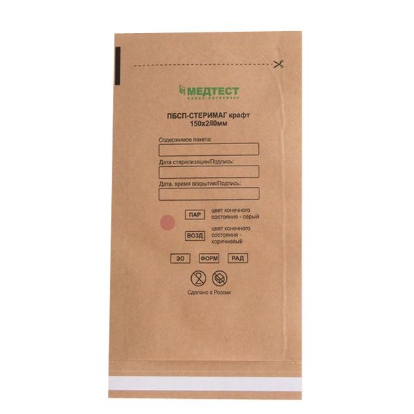 Пакеты из крафт-бумаги самоклеящиеся для паровой, воздушной, этиленоксидной стерилизации СтериМаг легко проницаемы для соответствующих стерилизующих агентов, в закрытом виде непроницаемы для микроорганизмов, сохраняют целостность после стерилизации соответствующим методом. На внешней стороне пакета нанесён индикатор, позволяющий отличить простерилизованные изделия от нестерилизованных.