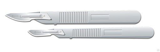 Скальпель одноразовый стерильный №15, Форма лезвия № 15. Предназначен для рассечения мягких тканей и сосудов при различных хирургических вмешательствах. Лезвие из нержавеющей или углеродистой стали. Ручка-держатель из полистирола ABS. Шейка ручки имеет ребристую поверхность и снабжена анатомическим упором для обеспечения удобной и надежной фиксации инструмента пальцами хирурга.